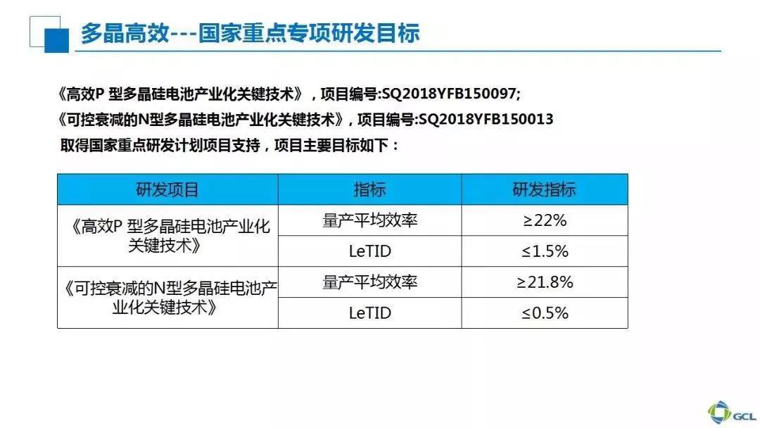 下面展示的是我们目前入选国家重点研发计划项目的科研专项,分别是由协鑫集成牵头的高效P型多晶产业化关键技术,以及其他一家知名企业牵头的N型多晶项目。目前两个项目都已完成公示,即将正式宣布,同时阿特斯也是我们在这两个项目上重要的合作伙伴。按照研发目标,三年之后,高效多晶电池的平均量产效率将达到22%以上。