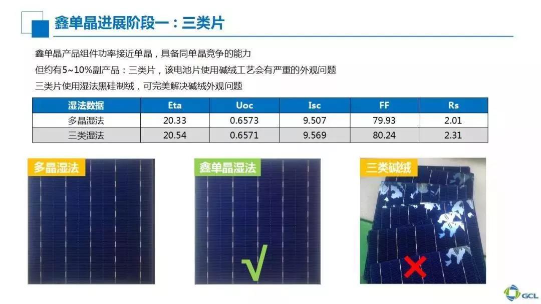 鑫单晶基本采用单晶高效电池的工艺,但三类片采用湿法黑硅工艺可以明显改善表面的外观问题。目前三类片的效率在第一阶段不到21%,但到了2019年,三类片的平均效率也在21%以上。