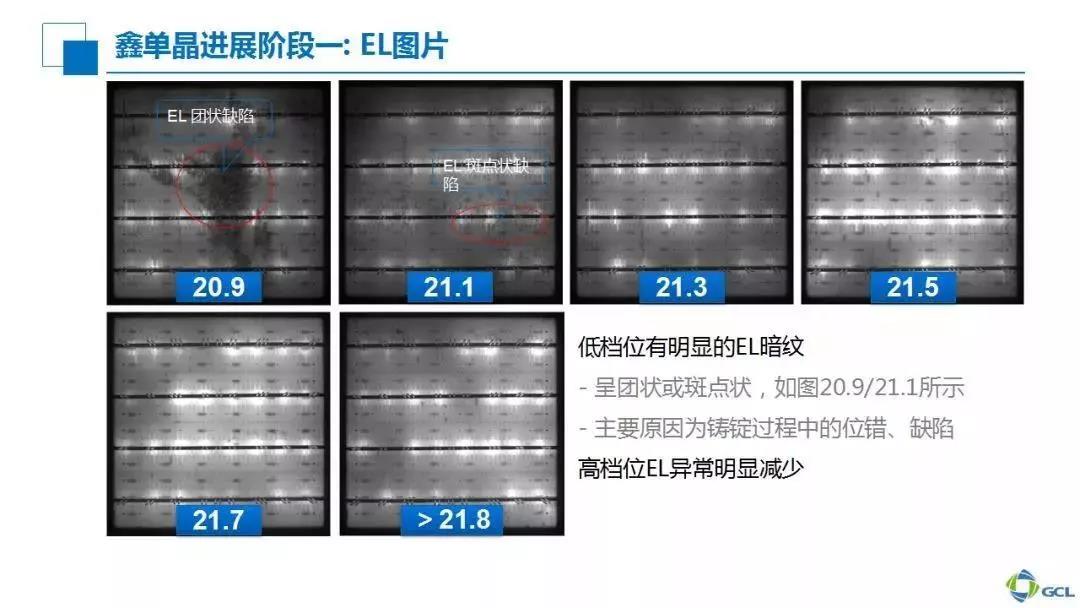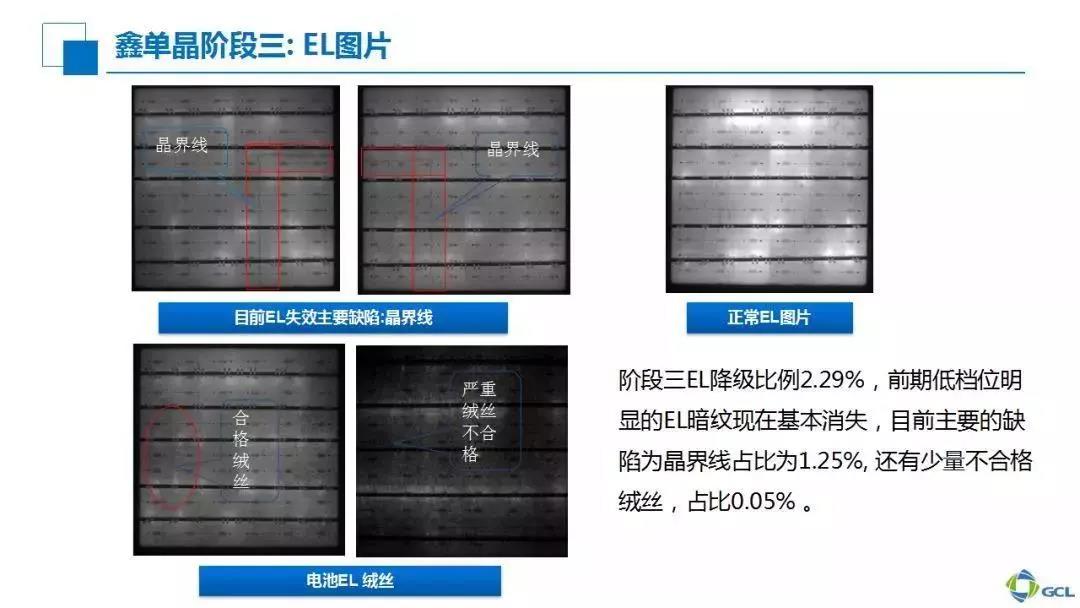 我们再来看EL方面。在第一阶段,红色圆圈部分显示了一些缺陷造成了效率偏低的情况,但通过第二、第三阶段可以看到比较明显的改善。