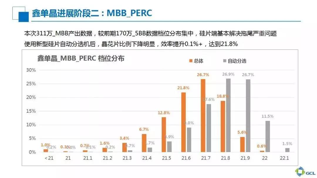 下面再来看自动分选。图中可以明显看到灰色主档位的效率接近21.8%—21.9%这样的平均效率,主档位效率往更高效率的右边偏移。通过硅片质量的改善,平均效率基本上可达到21.9%。