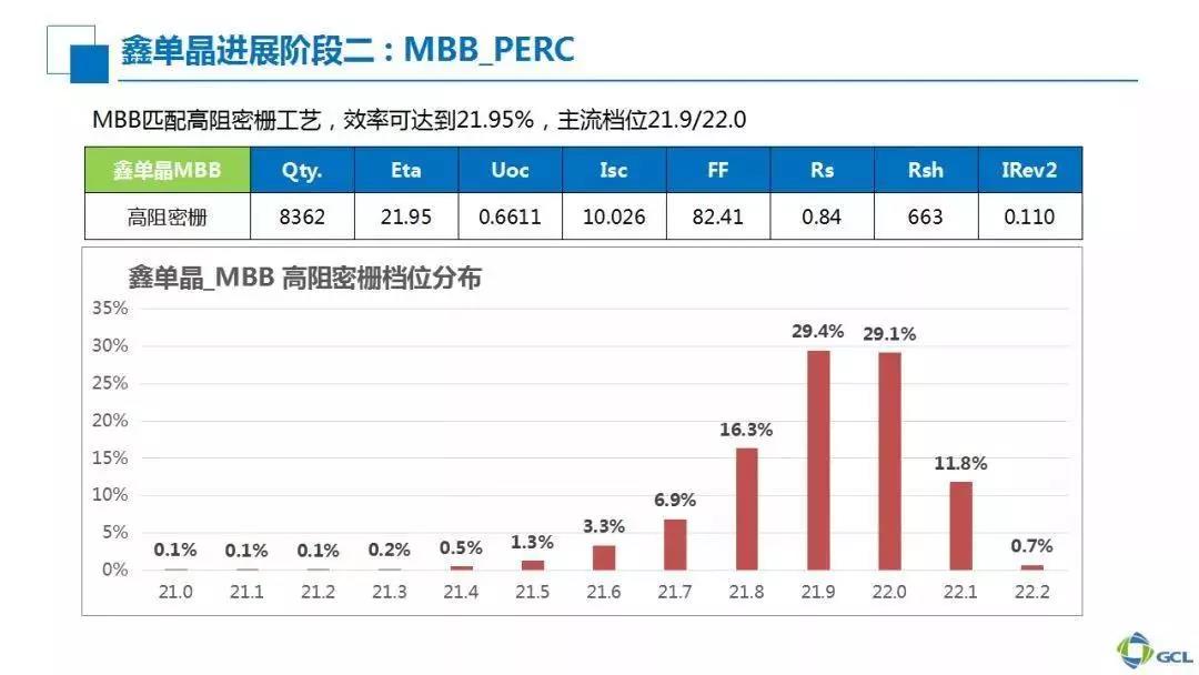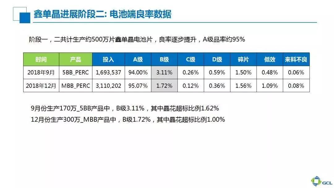 下面我们将从电池、组件以及光衰进展等三个层面重点介绍鑫单晶在协鑫集成的发展情况。我们可以看到,在第一阶段批量投产了大概170万片电池,并采用5BB工艺后,平均效率在21.2%—21.3%左右,同时组件档位功率可达305瓦左右。在这样一个鑫单晶的概念上,我们又叠加了多主栅工艺,可以将平均效率提高至22%。