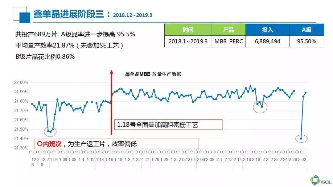 同时通过第一、第二阶段百万片的生产,在产线工艺控制上,平均良率在第一、第二阶段已经达到95%的平均水平。此外最关键的是,在鑫单晶生产过程中,晶花比例在逐渐下降。在鑫单晶硅片质量得到保证的前提下,进行工艺改善,能达到事半功倍的效果。大家可以看到,在鑫单晶还没有引入单晶PERC普遍使用SE工艺的情况下,仅从多主栅结合高阻密栅工艺的9千片试验结果来看,平均效率就达到21.95%。