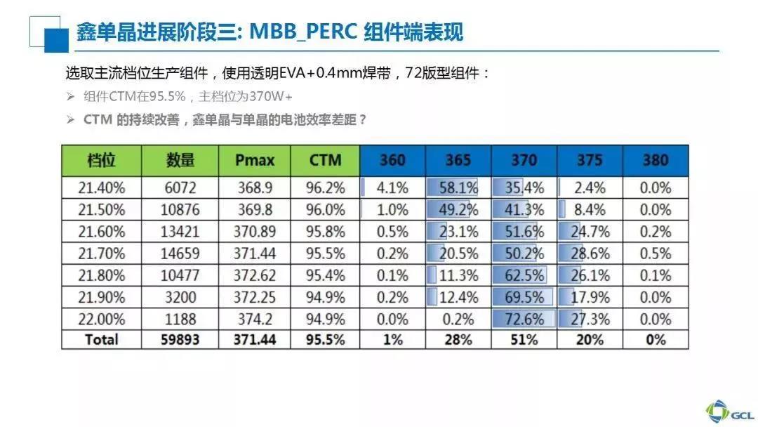 在硅片质量有保证以及电池工艺稳定生产的情况下,可以看到组件主档位功率在370W以上的占比达70%以上。下一步我们主要继续提升电池效率和组件CTM,这是我们后期持续改进的一个方向,也同样说明鑫单晶有很大的潜力,最终与直拉单晶逼平甚至超越。