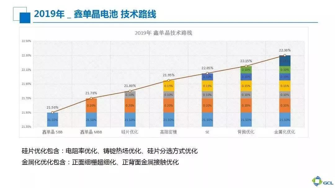 在2019全年计划中,我们坚信鑫单晶电池平均效率会登上21.8%的关口,这样就完全可以跟直拉单晶媲美。鑫单晶2019路线图强调两方面:一是硅片进一步优化,二是电池工艺持续改善。目前鑫单晶还没有导入单晶PERC普遍运用的SE工艺,后期若导入SE工艺以及进一步优化,22.2%—22.3%的电池量产平均效率目标是比较容易实现的。