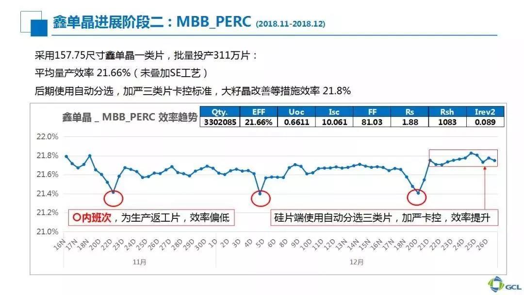 第一阶段,我们在硅片端采取了一些主要的改进措施。大家可以看到,第二阶段批量投产增加到300万片以上,同时以多主栅工艺取代第一阶段5BB工艺,并且在硅片端通过自动分选等工艺继续改善,在第二阶段后期,平均量产效率可以达到21.8%。我们采取的主要措施发力在硅片端,一个是分选,一个是工艺。
