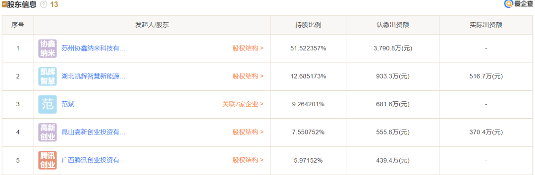 昆山协鑫光电材料有限公司成立于2019年12月,法定代表人为范斌,经营范围包含光电材料科技领域内的技术开发、技术咨询、技术服务、技术转让等。该公司由昆山高新创业投资有限公司、湖北凯辉智慧新能源基金合伙企业(有限合伙)等13位股东共同持股,持股比例未披露。